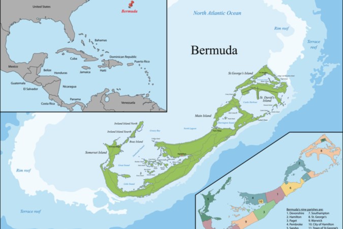 Feature photo of a map of Bermuda and it’s location in relation to the North American seaboard by Shutterstock.com.