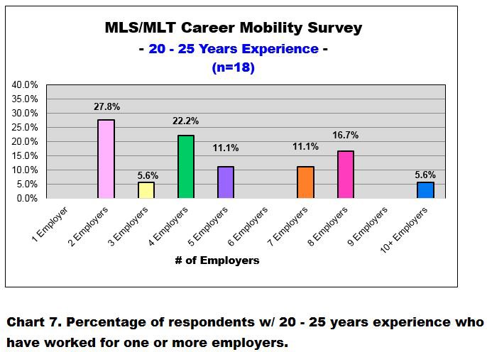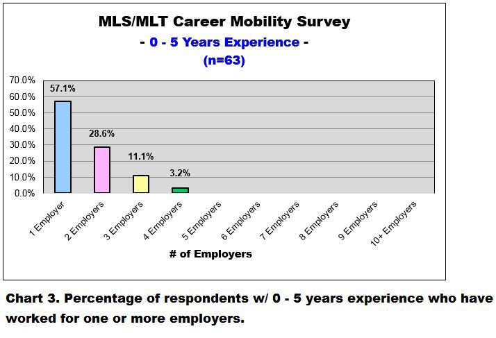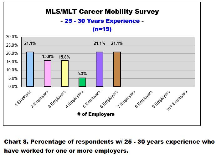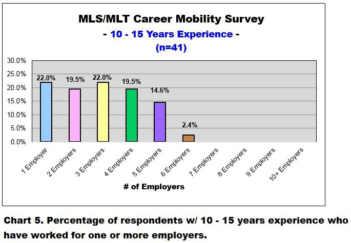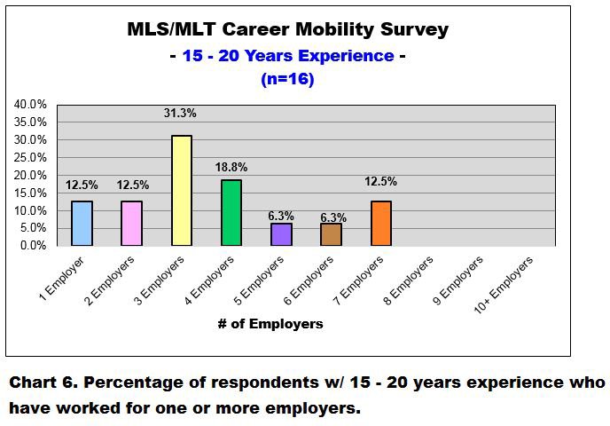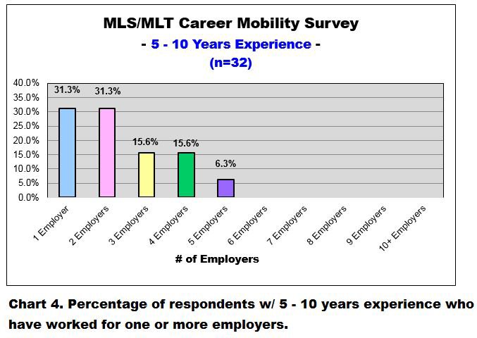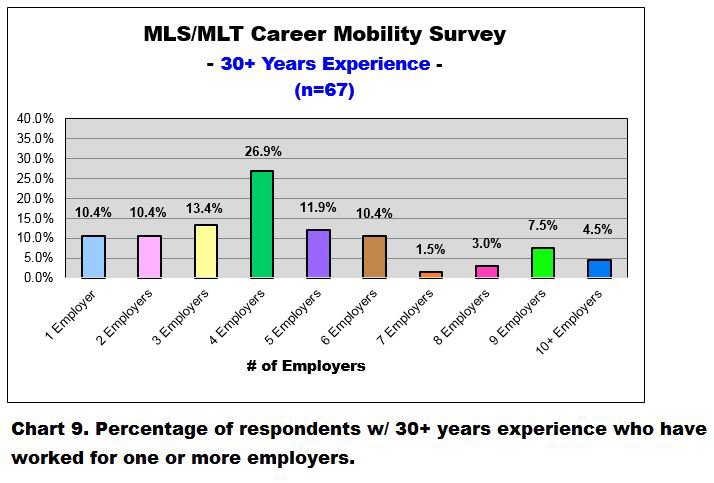 This survey is not an indictment of either the MLS/MLT that chooses to stay at 1 employer for their entire career or have 10 or more employers over their career. There is no wrong or right answer and there are benefits for individuals in each scenario. There was no grand design for this survey, just obtain knowledge of MLS/MLT movements in the laboratory community. Hopefully, there will be a larger, more in-depth survey about how mobile MLSs/MLTs are during their career. The data can be beneficial to MLSs/MLTs, managers, and possibly human resource professionals. Understanding why MLSs/MLTs change employers can be helpful also, especially with the coming predicted shortage.